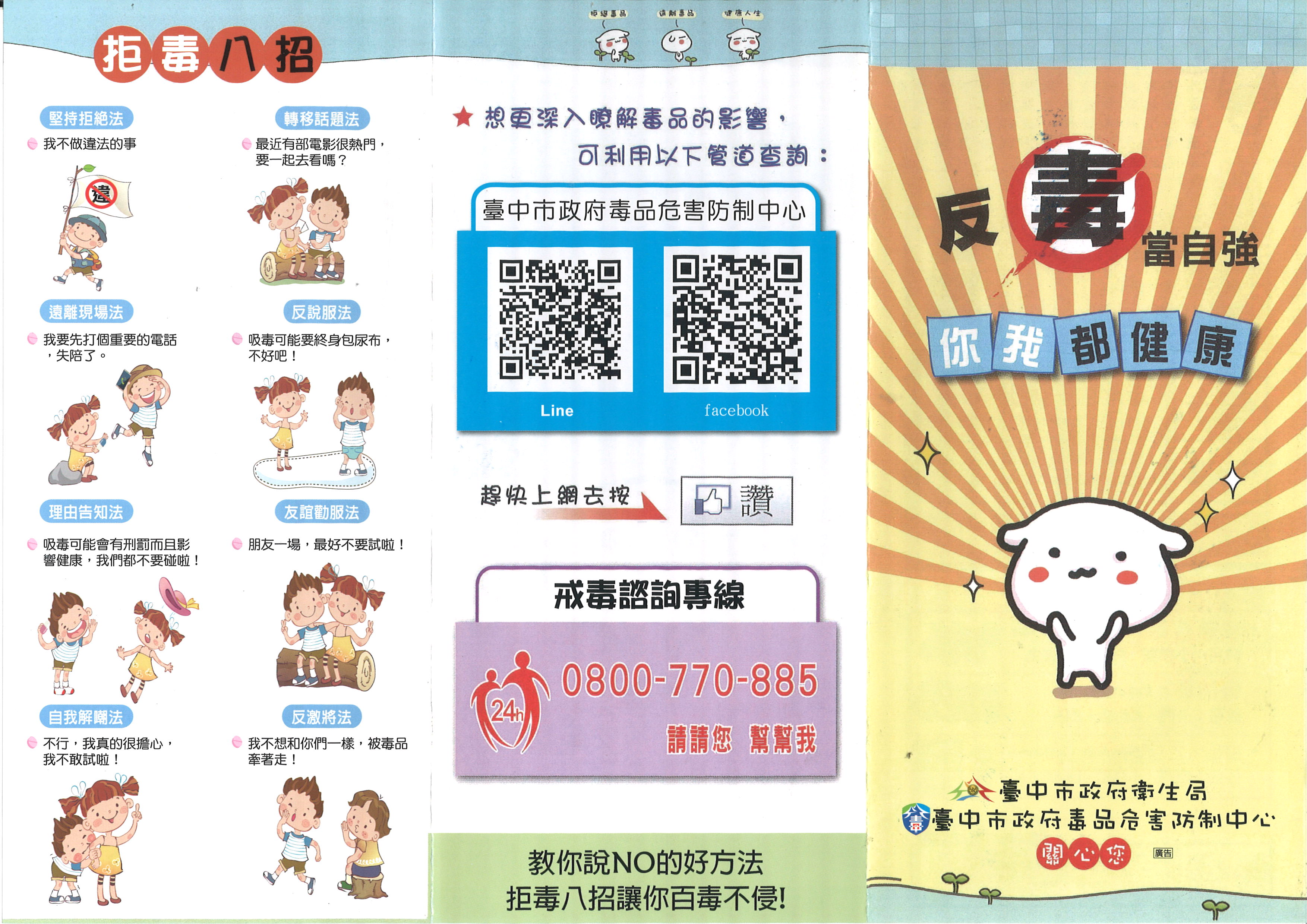 反毒當自強 ■拒毒八招: 堅決拒絕法、轉移話題法、遠離現場法、反說服法、 理由告知法、友誼勸服法、自我解嘲法、反激將法。 ■如何說不~我要如何拒絕毒品 第一招:生活作息正常 第二招:絕對不好奇試用品 第三招:建立正確情緒疏導法 第四招:不靠藥物提神與減肥 第五招:遠離是非場所 第六招:不接受陌生人的飲料、香菸