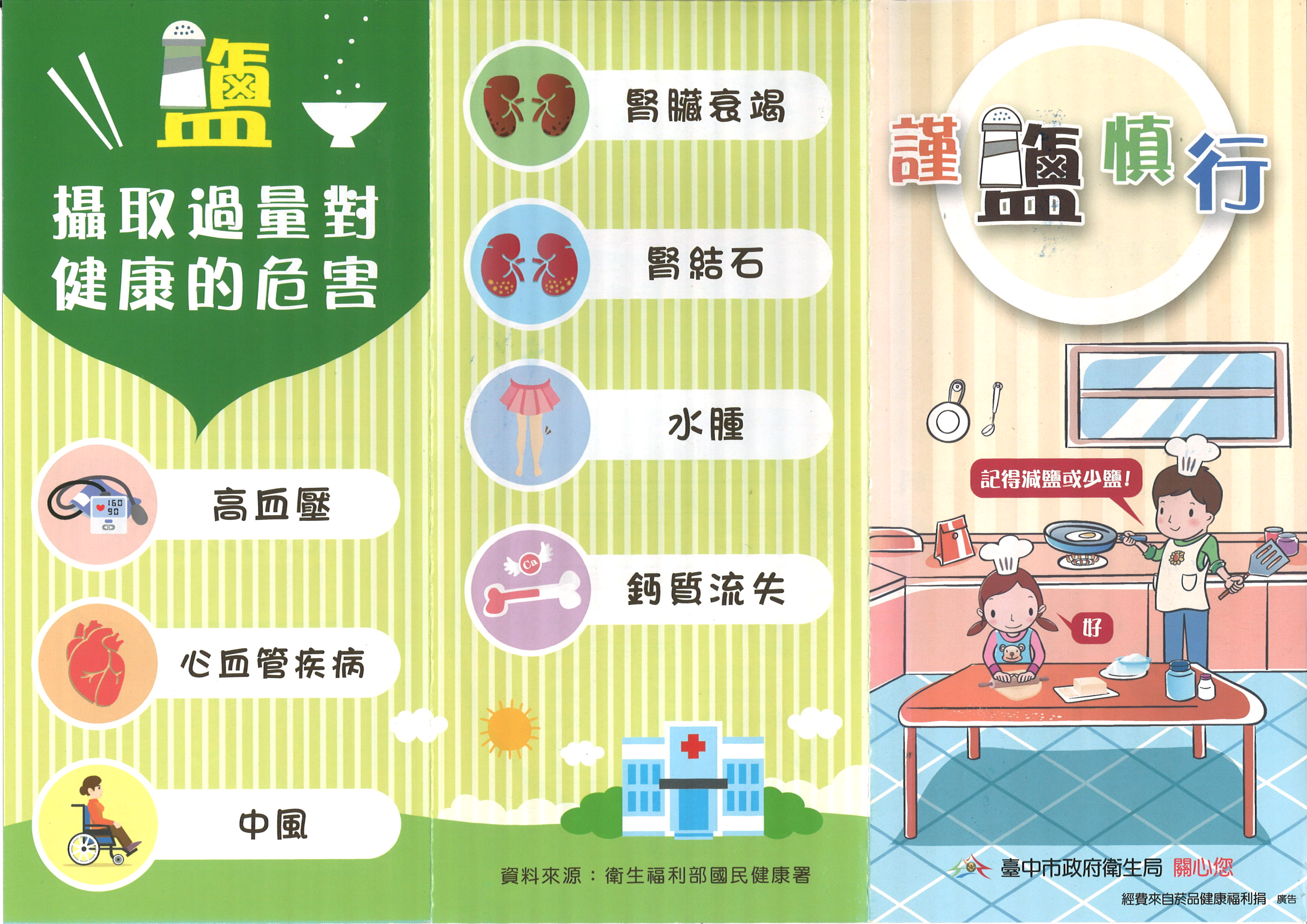 鹽(鈉)攝取過多會危害健康。鹽攝取過量不單會令血壓上升, 亦會損害心臟、腦部或腎臟等,久之更會逐漸導致慢性病。