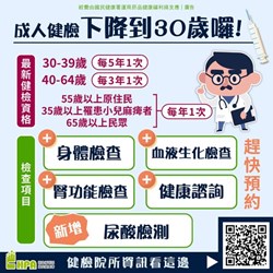 政府也補助30至39歲民眾每5年1次、40至64歲民眾每3年1次、65歲以上民眾每年1次的成人預防保健服務喔!