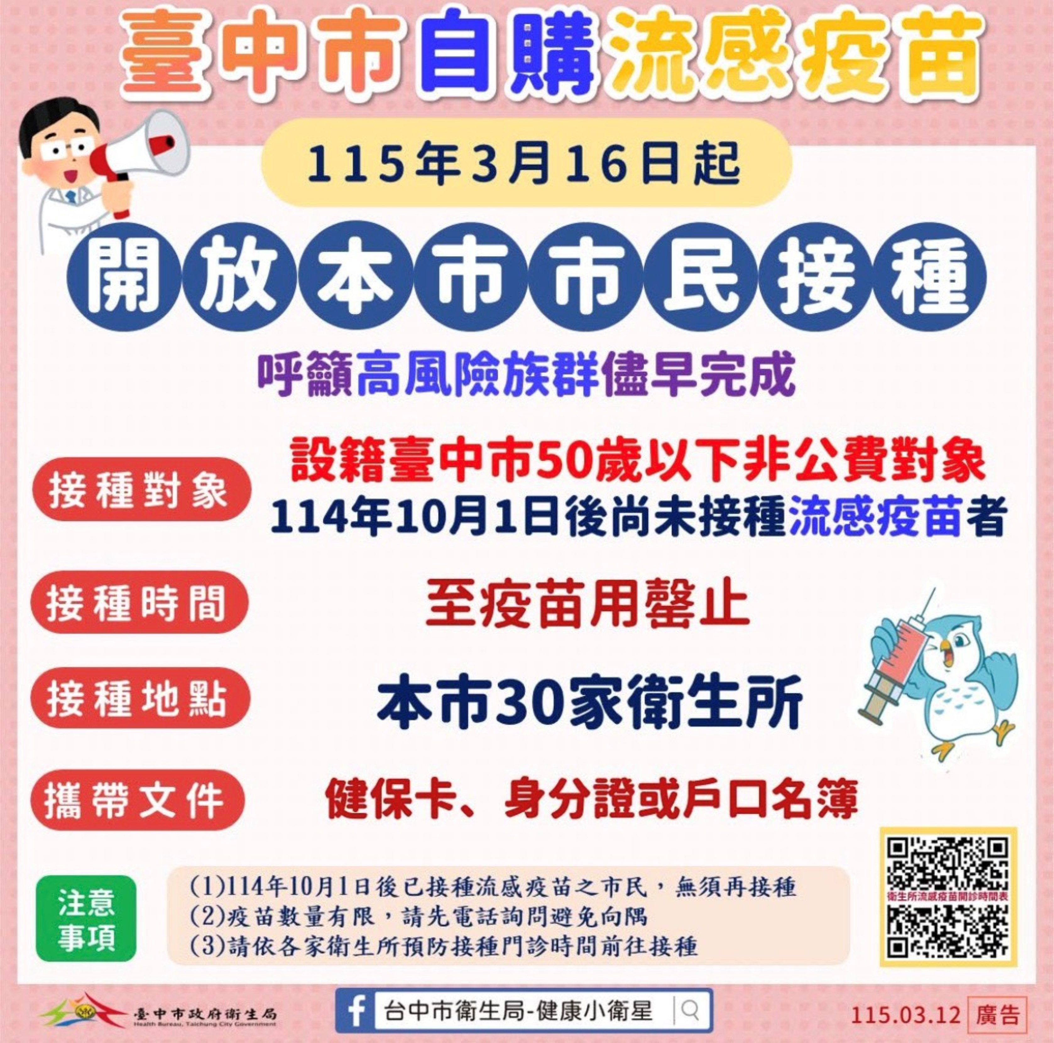 2.資格條件:設籍臺中市50歲以下非公費對象之市民(114101日後尚未接種過流感疫苗)